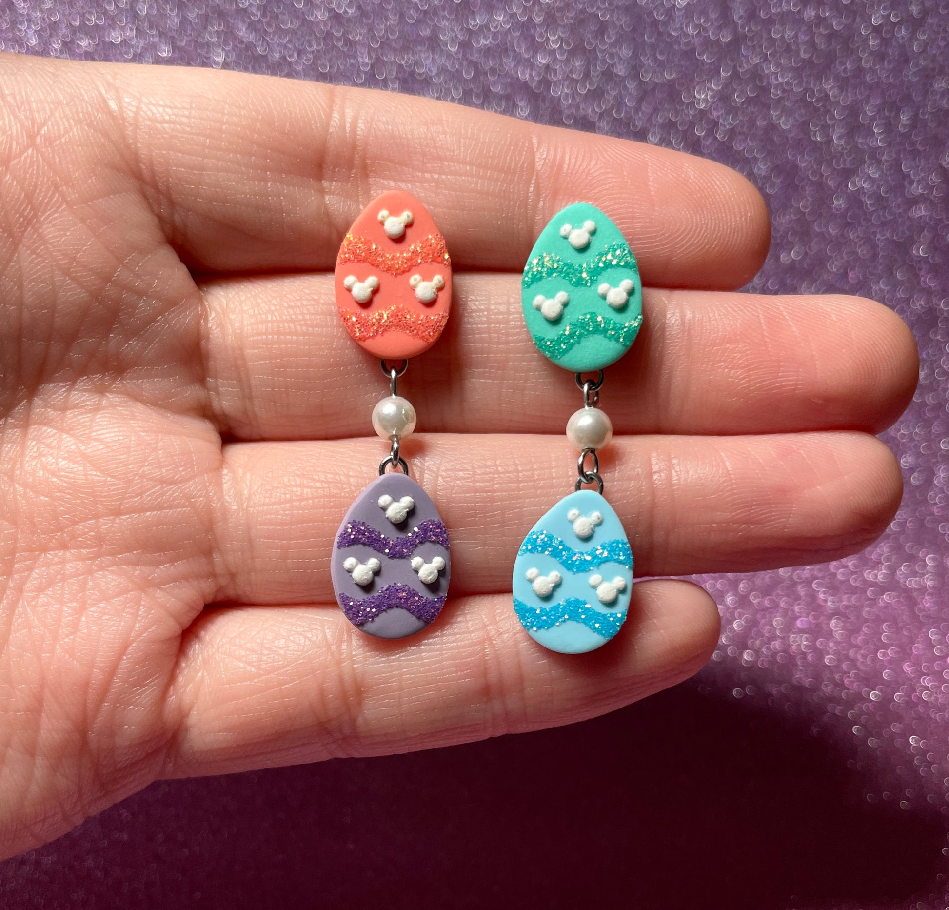- These earrings feature Easter eggs decorated with little cute mouse heads
